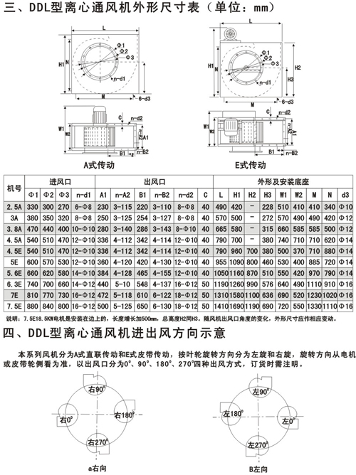 一。特性及應用 DDL系列風機采用效率較高的窄葉面,多翼式寬葉輪,具有最佳的葉輪直徑與寬葉比,空氣動力性能優(yōu)良。A式直聯(lián)傳動采用方形箱體,B5型電機,可以0度。90度180角度自由安裝,非常方便用戶的選型及安裝使用;E式方形箱體電機頂置,使整體變得扁平,結(jié)構(gòu)緊湊,安裝簡便。本系列風機的顯著特點是體積小,風量大,風壓高,噪聲低,有著軸流風機的風量大,離心風機的風壓高,噪聲低的優(yōu)點,是環(huán)保通風工程設施配套的理想風機。適用于單位食堂,飲食店,賓館灑樓等廚房排油煙送新風,及工礦企業(yè),娛樂場所,地下室等場合的通風,同時亦廣泛配套使用在糧食機械,化工機械,塑料機械等生產(chǎn)線設備上。 本系列風機分為A直聯(lián)傳動和E式皮帶傳動,按葉輪旋轉(zhuǎn)方向分為左旋和右旋,旋轉(zhuǎn)方向從電機或皮帶輪側(cè)看為準,以出風口分為0度,90度,270度四種出風方式,訂貨時需注明。