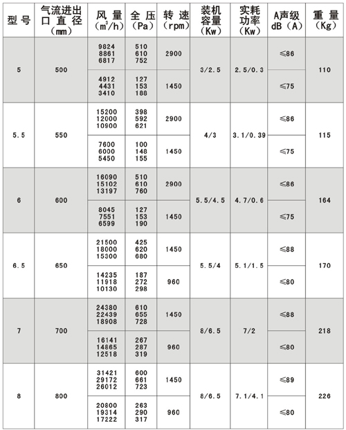 八.HTF(GYF)-D型低速壓型消防高溫排煙軸流通風(fēng)機(jī)性能參數(shù)表