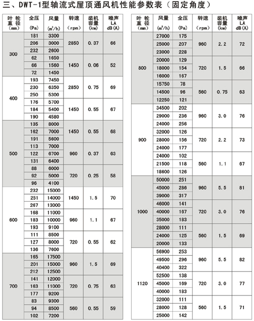 一、特點(diǎn) 1.型式規(guī)格多,應(yīng)用范圍廣:可根據(jù)使用場合的風(fēng)量,風(fēng)壓和噪聲的不同要求,選用以下型式的風(fēng)機(jī): 軸流式屋頂通風(fēng)機(jī):代號(hào)為DWT-I型,具有風(fēng)量大,壓力較離心式風(fēng)機(jī)的特點(diǎn)。同時(shí)根據(jù)用戶要求還可設(shè)計(jì)成雙向旋轉(zhuǎn)可逆式,具有正反式?jīng)r等效的特點(diǎn)。 2.效率高噪聲低本風(fēng)機(jī)系采用先進(jìn)的CAD系列軟件,經(jīng)多目標(biāo)優(yōu)化設(shè)計(jì)開發(fā)。本系列風(fēng)機(jī)中1200.1400.1500.1600.2000.及2400mm風(fēng)機(jī)采用同值徑不同轉(zhuǎn)速,不同角度改變幾量.風(fēng)壓的方法,以滿足不同使用工況的需要,達(dá)到風(fēng)機(jī)與系統(tǒng)匹配,以利實(shí)現(xiàn)節(jié)能和降低噪聲; 3.質(zhì)輕。高強(qiáng)。耐腐蝕;風(fēng)機(jī)葉輪可根據(jù)工作空氣介質(zhì)不同的腐蝕性而采用不同的材質(zhì),分別有ABS(工程塑料)FRP(玻璃鋼)和鋁合金板材制作,對于壓力要求高,風(fēng)機(jī)轉(zhuǎn)速較大的離心風(fēng)機(jī),葉輪表面較特殊的鍍鋅加噴塑耐蝕處理,不僅降低整機(jī)重量且有良好的耐腐蝕能力; 4.運(yùn)轉(zhuǎn)平穩(wěn),壽命長;本風(fēng)機(jī)的轉(zhuǎn)動(dòng)慣量小,動(dòng)平衡精度高,運(yùn)轉(zhuǎn)平穩(wěn),各項(xiàng)性能指標(biāo)的工廠內(nèi)控標(biāo)準(zhǔn)要求均高于風(fēng)機(jī)待業(yè)標(biāo)準(zhǔn),能確保風(fēng)機(jī)長期穩(wěn)定地運(yùn)行; 5.適用面廣:本風(fēng)機(jī)可以根據(jù)使用要求,制造成防爆型,阻燃型,適用于抗老化,抽送易燃易爆及有腐蝕性氣體的場合; 6.外型美觀:本風(fēng)機(jī)的風(fēng)帽部件采用玻璃鋼制作,外表采用進(jìn)口膠衣樹脂膜,曲面過渡柔和,美觀大方,實(shí)用性強(qiáng);也可根據(jù)用戶要求制成鋼風(fēng)帽經(jīng)鍍鋅噴塑(PVC)處理; 7.使用條件:介質(zhì)溫度不超過60攝氏度,氣體中不允許含有過量粘性物,含塵量小于100mg/m。對介質(zhì)溫度高的場合,我廠有高溫風(fēng)機(jī)技術(shù)可提供產(chǎn)品使用。 8.本產(chǎn)品經(jīng)浙江省產(chǎn)品技術(shù)監(jiān)督所檢測合格,檢測項(xiàng)目含阻燃,導(dǎo)電性能,防爆,抗風(fēng)性能等,由市產(chǎn)品技術(shù)監(jiān)督局監(jiān)制。二、型號(hào)結(jié)構(gòu)說明 1.軸流式屋頂風(fēng)機(jī)直徑自300-2400mm,供十七種機(jī)號(hào),離心式屋頂風(fēng)機(jī)有300-1000mm九種機(jī)號(hào)。還可根據(jù)用戶需要提供其它機(jī)號(hào)的風(fēng)機(jī); 2.各種型號(hào)的風(fēng)機(jī)結(jié)構(gòu)可參閱總裝圖,它由葉輪,風(fēng)筒,風(fēng)帽,傳動(dòng)部件,活頁風(fēng)門,防鳥網(wǎng),安全網(wǎng)等部件組成;(以上配置,按用戶要求制作) 3.風(fēng)機(jī)傳動(dòng)形式:DWT-1型風(fēng)機(jī)直徑<_2200mm采用電機(jī)直聯(lián)傳動(dòng),2200mm以上風(fēng)機(jī)采用皮帶傳動(dòng)形式,也可根據(jù)客戶要求采用減速器傳動(dòng)形式,活頁風(fēng)門有重力式,電動(dòng)式和手動(dòng)式三種。 4.屋頂風(fēng)使用范圍廣且數(shù)量大,根據(jù)用途的需要結(jié)構(gòu)形式繁雜,本廠可按用戶不同的技術(shù)要求,進(jìn)行研制開發(fā),并對外形結(jié)構(gòu)進(jìn)行改進(jìn)。