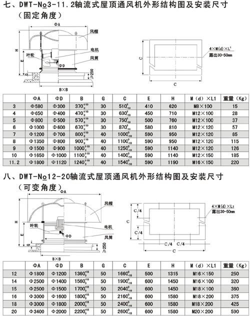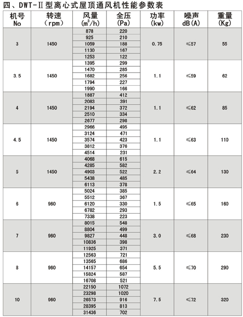 一、特點 1.型式規(guī)格多,應用范圍廣:可根據(jù)使用場合的風量,風壓和噪聲的不同要求,選用以下型式的風機: 離心式屋頂通風機:代號為DWT-II型,適用于風量較小而壓力要求較高的場合; 2.效率高噪聲低本風機系采用先進的CAD系列軟件,經(jīng)多目標優(yōu)化設計開發(fā)。本系列風機中1200.1400.1500.1600.2000.及2400mm風機采用同值徑不同轉(zhuǎn)速,不同角度改變幾量.風壓的方法,以滿足不同使用工況的需要,達到風機與系統(tǒng)匹配,以利實現(xiàn)節(jié)能和降低噪聲; 3.質(zhì)輕。高強。耐腐蝕;風機葉輪可根據(jù)工作空氣介質(zhì)不同的腐蝕性而采用不同的材質(zhì),分別有ABS(工程塑料)FRP(玻璃鋼)和鋁合金板材制作,對于壓力要求高,風機轉(zhuǎn)速較大的離心風機,葉輪表面較特殊的鍍鋅加噴塑耐蝕處理,不僅降低整機重量且有良好的耐腐蝕能力; 4.運轉(zhuǎn)平穩(wěn),壽命長;本風機的轉(zhuǎn)動慣量小,動平衡精度高,運轉(zhuǎn)平穩(wěn),各項性能指標的工廠內(nèi)控標準要求均高于風機待業(yè)標準,能確保風機長期穩(wěn)定地運行; 5.適用面廣:本風機可以根據(jù)使用要求,制造成防爆型,阻燃型,適用于抗老化,抽送易燃易爆及有腐蝕性氣體的場合; 6.外型美觀:本風機的風帽部件采用玻璃鋼制作,外表采用進口膠衣樹脂膜,曲面過渡柔和,美觀大方,實用性強;也可根據(jù)用戶要求制成鋼風帽經(jīng)鍍鋅噴塑(PVC)處理; 7.使用條件:介質(zhì)溫度不超過60攝氏度,氣體中不允許含有過量粘性物,含塵量小于100mg/m。對介質(zhì)溫度高的場合,我廠有高溫風機技術(shù)可提供產(chǎn)品使用。 8.本產(chǎn)品經(jīng)浙江省產(chǎn)品技術(shù)監(jiān)督所檢測合格,檢測項目含阻燃,導電性能,防爆,抗風性能等,由市產(chǎn)品技術(shù)監(jiān)督局監(jiān)制。二、型號結(jié)構(gòu)說明 1.軸流式屋頂風機直徑自300-2400mm,供十七種機號,離心式屋頂風機有300-1000mm九種機號。還可根據(jù)用戶需要提供其它機號的風機; 2.各種型號的風機結(jié)構(gòu)可參閱總裝圖,它由葉輪,風筒,風帽,傳動部件,活頁風門,防鳥網(wǎng),安全網(wǎng)等部件組成;(以上配置,按用戶要求制作) 3.風機傳動形式:DWT-1型風機直徑<_2200mm采用電機直聯(lián)傳動,2200mm以上風機采用皮帶傳動形式,也可根據(jù)客戶要求采用減速器傳動形式,活頁風門有重力式,電動式和手動式三種。 4.屋頂風使用范圍廣且數(shù)量大,根據(jù)用途的需要結(jié)構(gòu)形式繁雜,本廠可按用戶不同的技術(shù)要求,進行研制開發(fā),并對外形結(jié)構(gòu)進行改進。